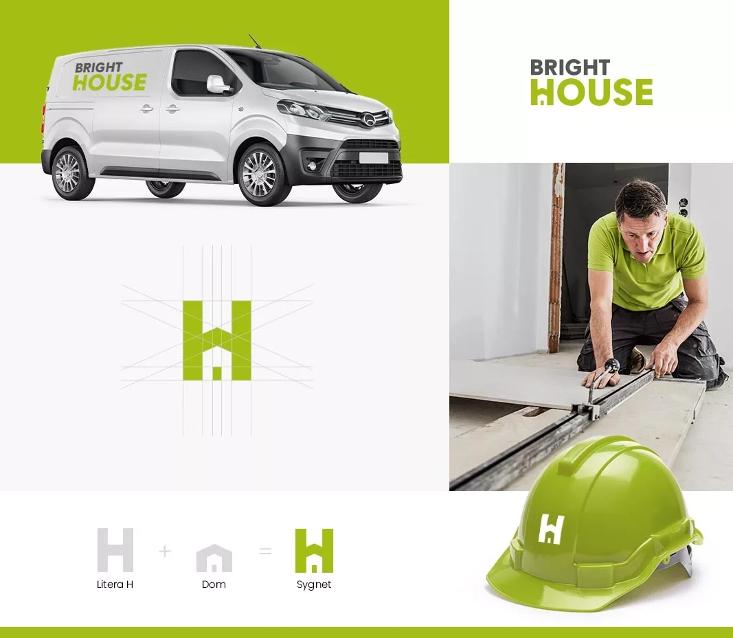 Kreatywne połączenie litery H oraz kształtu domu tworzy sygnet, który jest unikalny i łatwo rozpoznawalny. Całość przekazu, dzięki wykorzystaniu pozytywnego i żywiołowego koloru limonki, nadaje atrakcyjności marce i znacząco wyróżnia się na rynku usług remontowo-budowlanych.